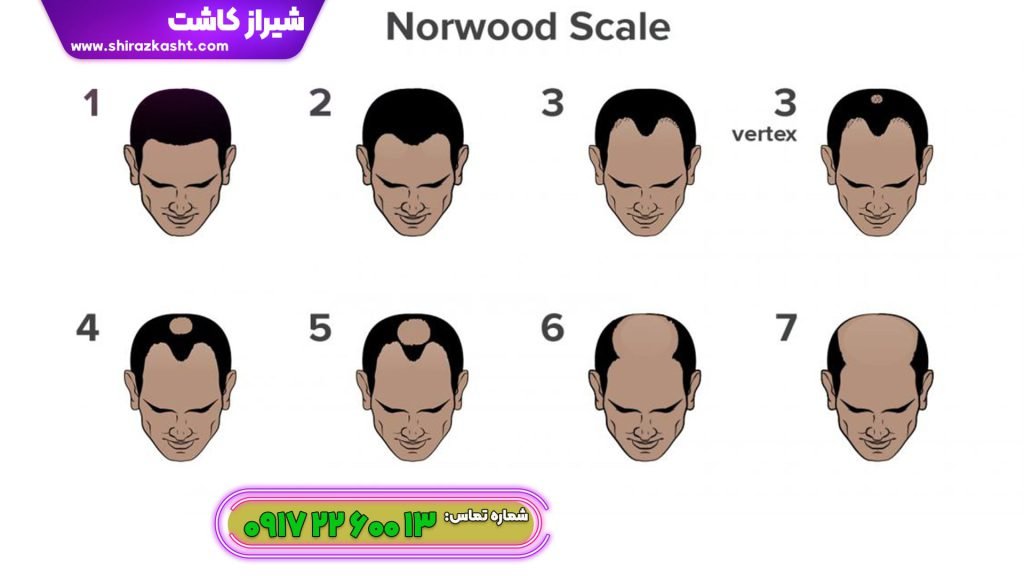 مهم ترین عامل تاثیر گذار بر قیمت کاشت مو ، الگوی ریزش موی فرد است. که طبق عکس زیر طبقه بندی می شود. تا الگوی ریزش موی شماره 2 که معمولا تا سن 25 سال اتفاق می افتد نیاز به کاشت مو نبوده و فرد باید با انجام پی ار پی مو شیراز و یا خوردن مکمل های تقویت مو جلو ریزش موی خود را بگیرد. در صورتیکه طبق عکس، الگوی ریزش موی شما به الگوی 3 به بعد افزایش پیدا کند، باید فرد اقدام به کاشت مو کند.